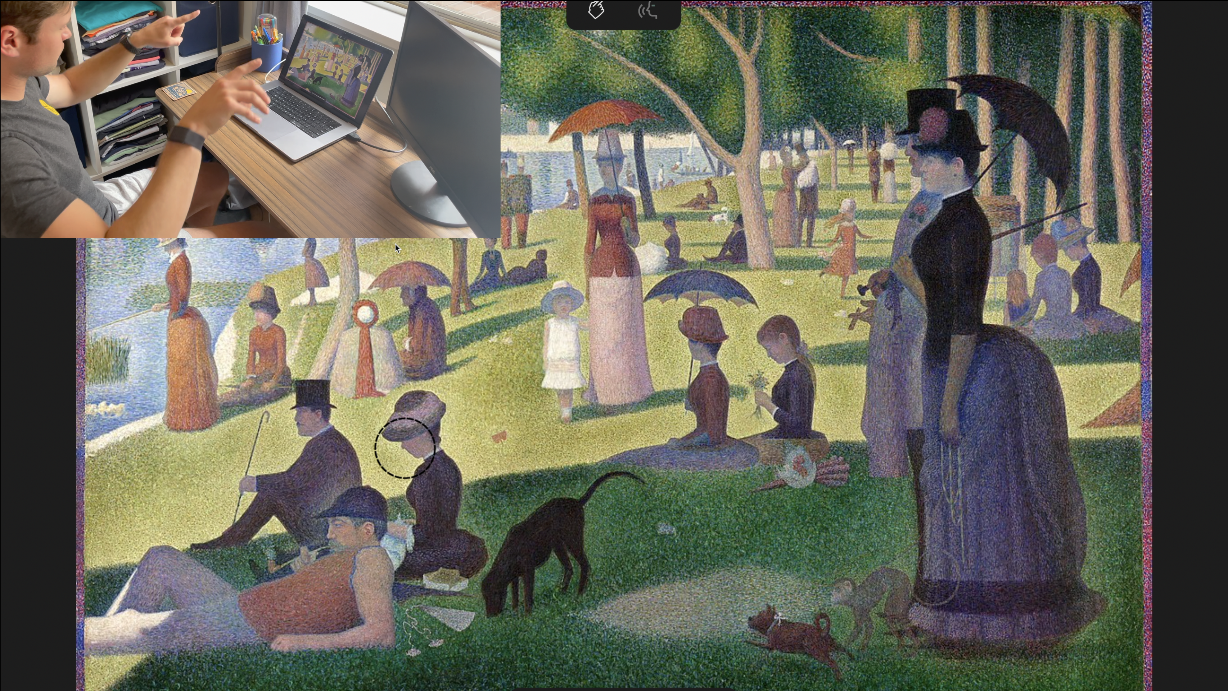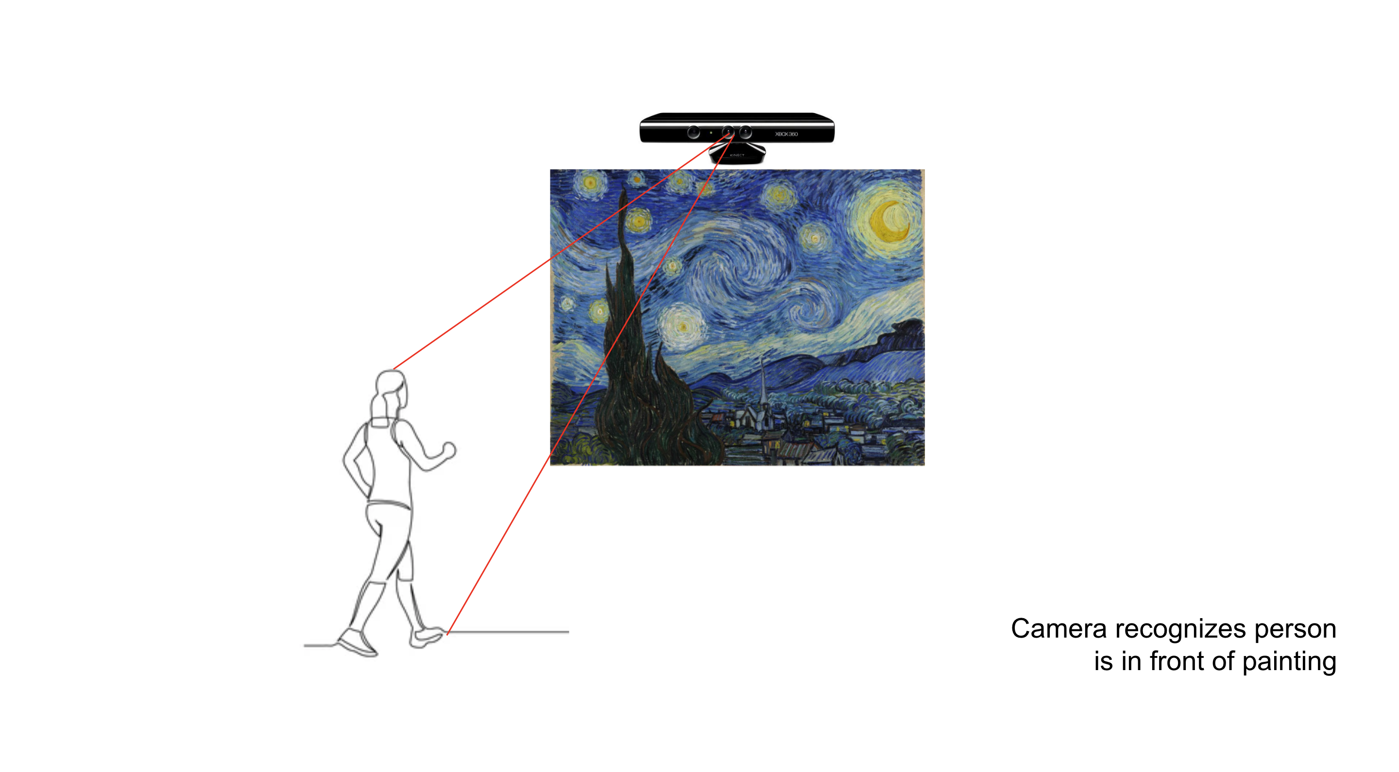 A user can engage with the system by pointing at different parts of the painting with their hand.