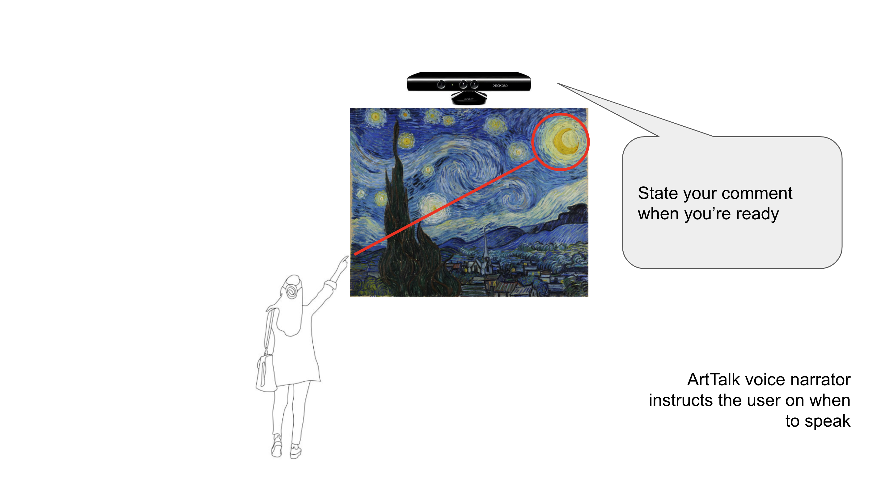 So, we designed ArtTalk. With ArtTalk, you don't have to keep your thoughts to yourself. A visitor simply points at a detail and shares their comment aloud. The application tracks your hand gesture and captures your voice, letting you pin your thoughts directly on the art piece.