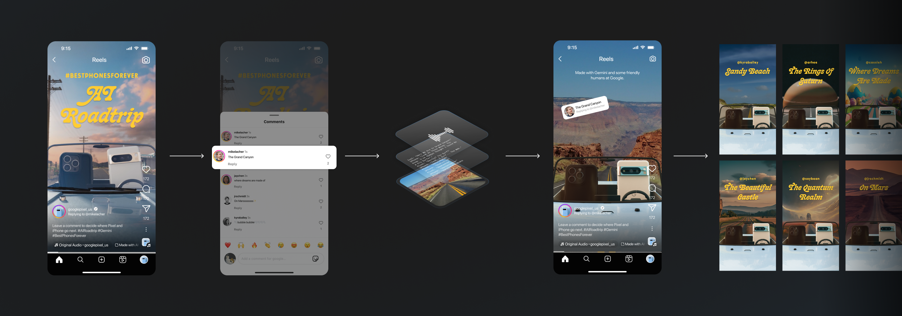 AI Roadtrip was an experimental short form video campaign for the Google Pixel. The campaign featured Pixel and iPhone travelling around to destinations suggested by user comments on Instagram.