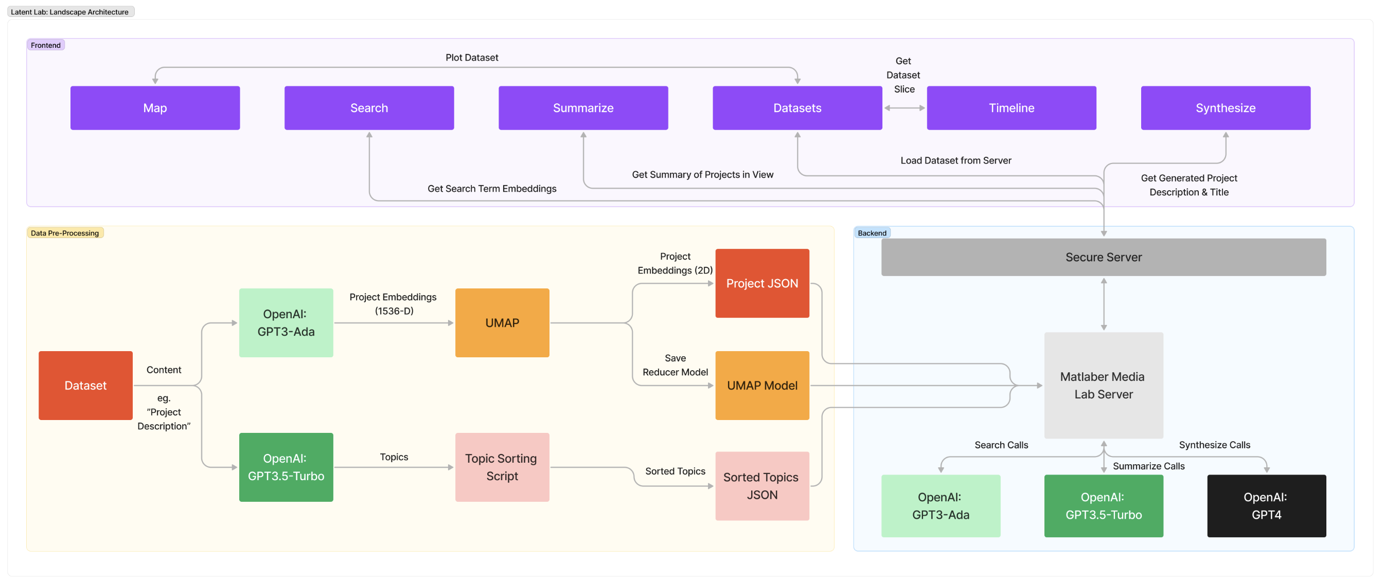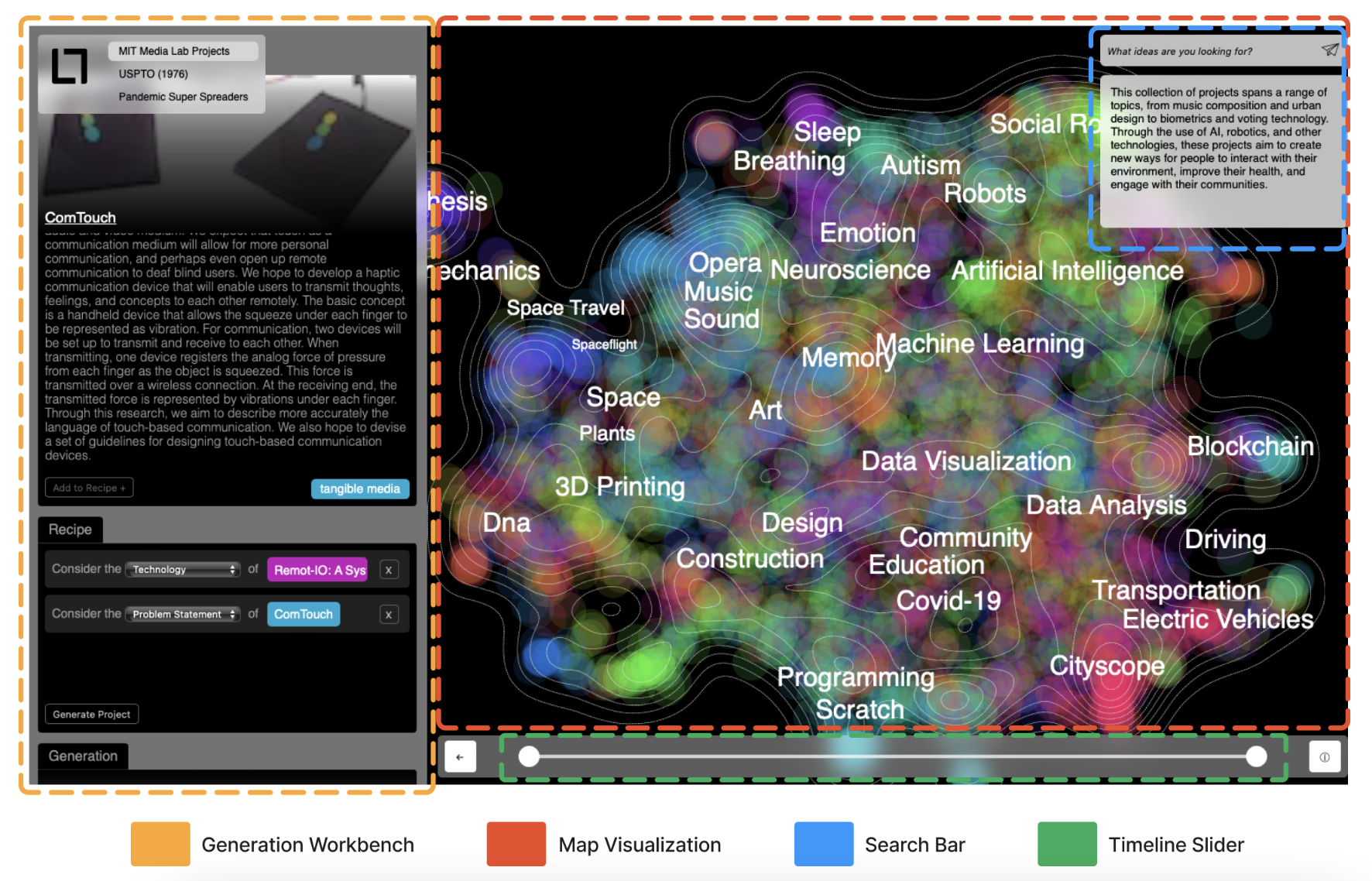 Latent Lab is made up of 4 major components: Map Visualization, Generation Workbench, Search and Summarization, and Timeline Slider