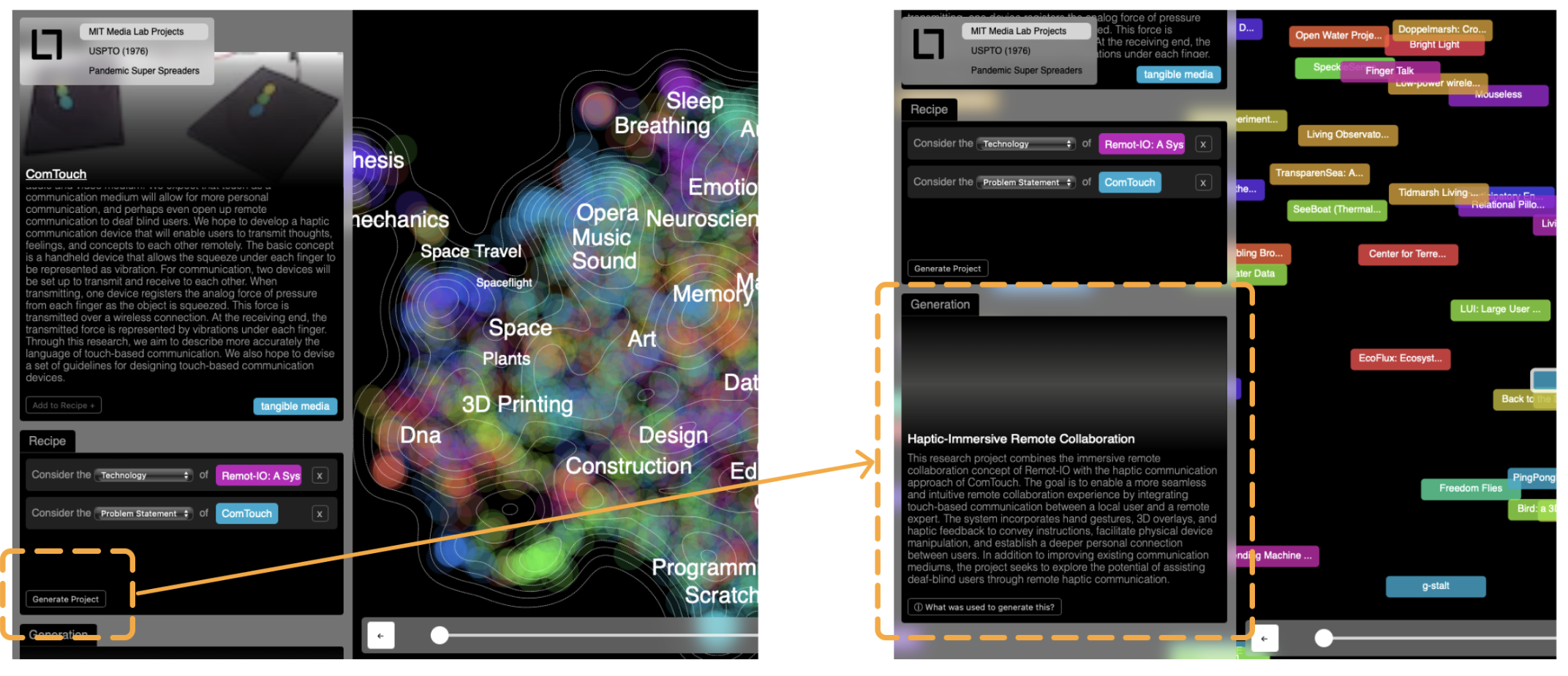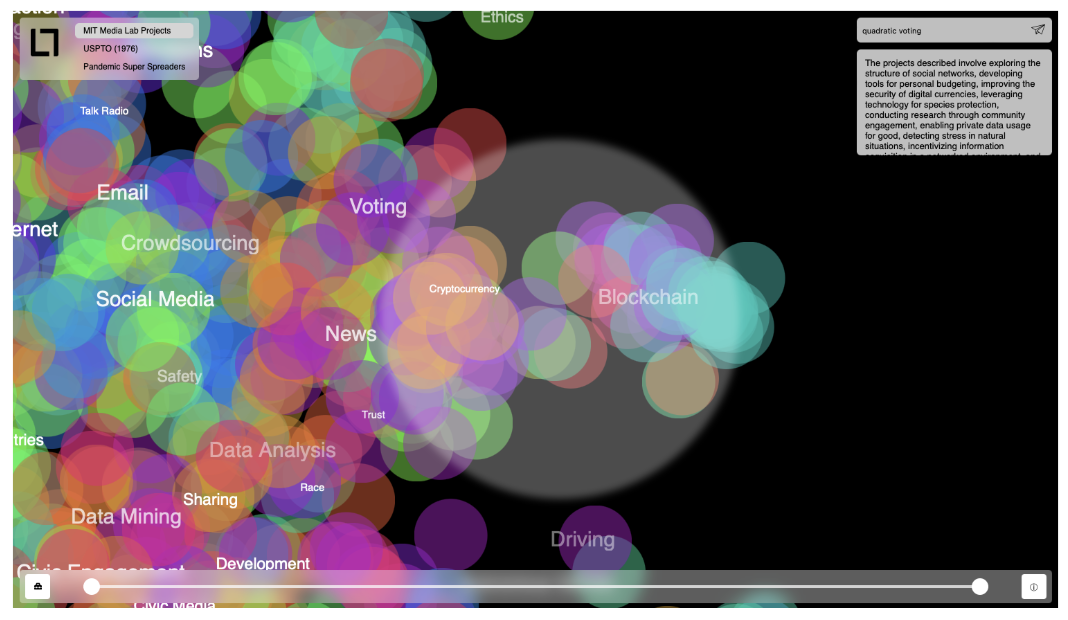 In the map visualization, each dot represents a piece of information from the knowledge base. In the case of the MIT Media Lab, each dot represents a project.