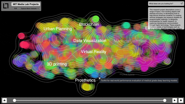 We can consider the example of all the projects at the MIT Media Lab. There are thousands of projects, across a wide range of topics. Currently, these projects are organized by manual human tagging or naive keyword search. There's a huge opportunity to leverage the power of machine learning to organize and explore this information.
