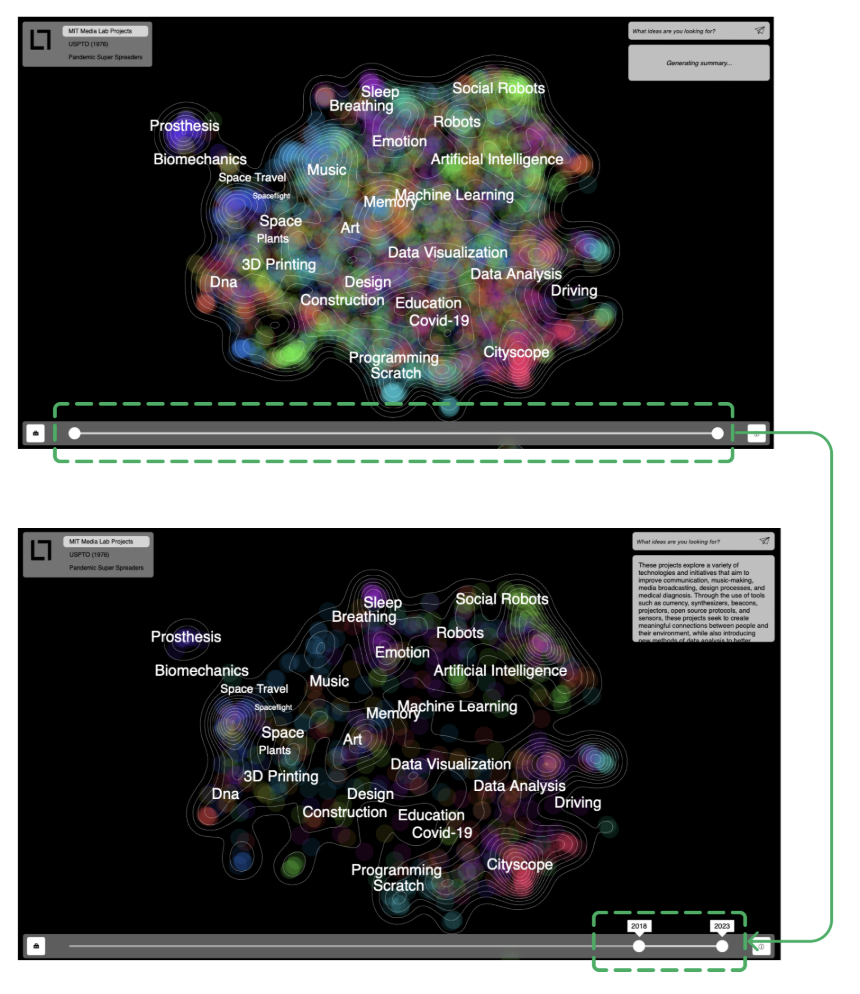A time-travel slider to explore how research themes evolve over time. This is especially useful when zoomed in to a specific part of the map to see how research has blossomed.