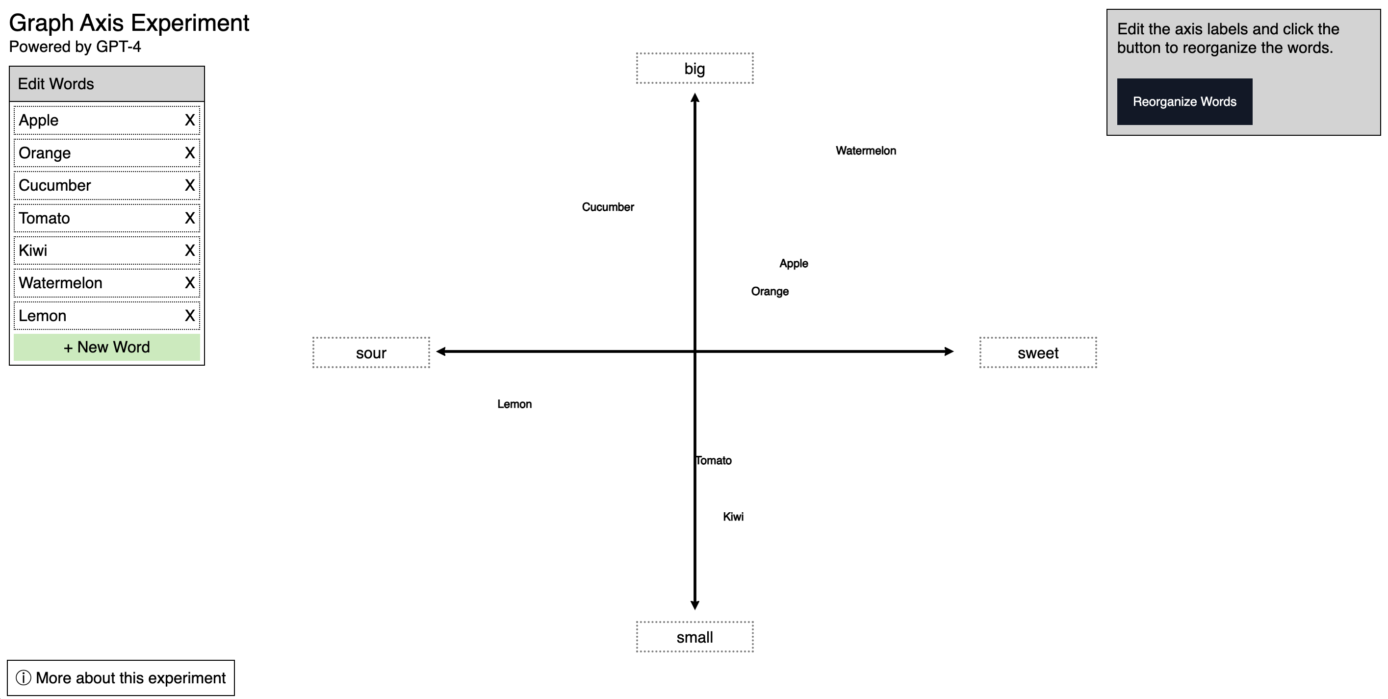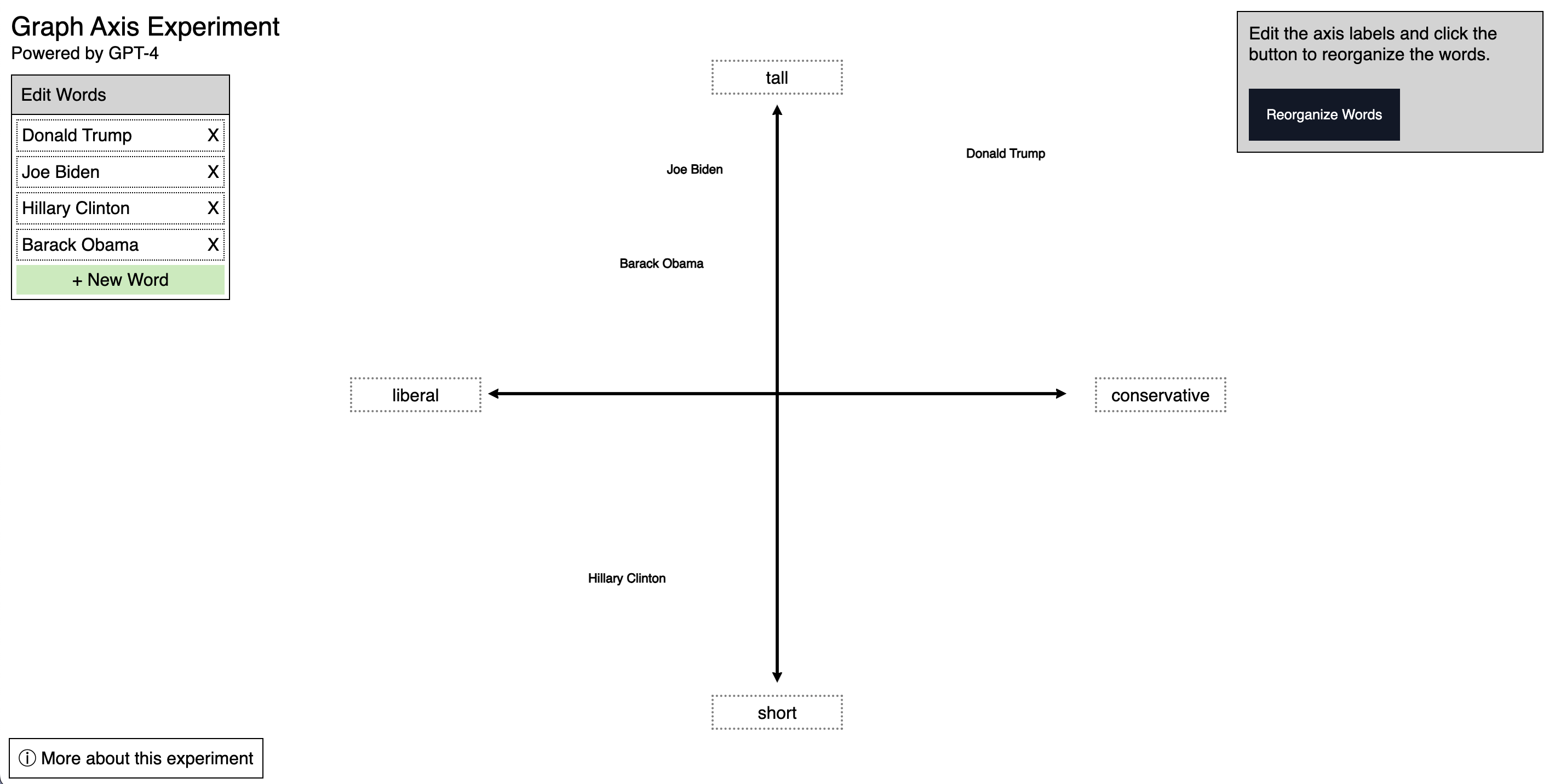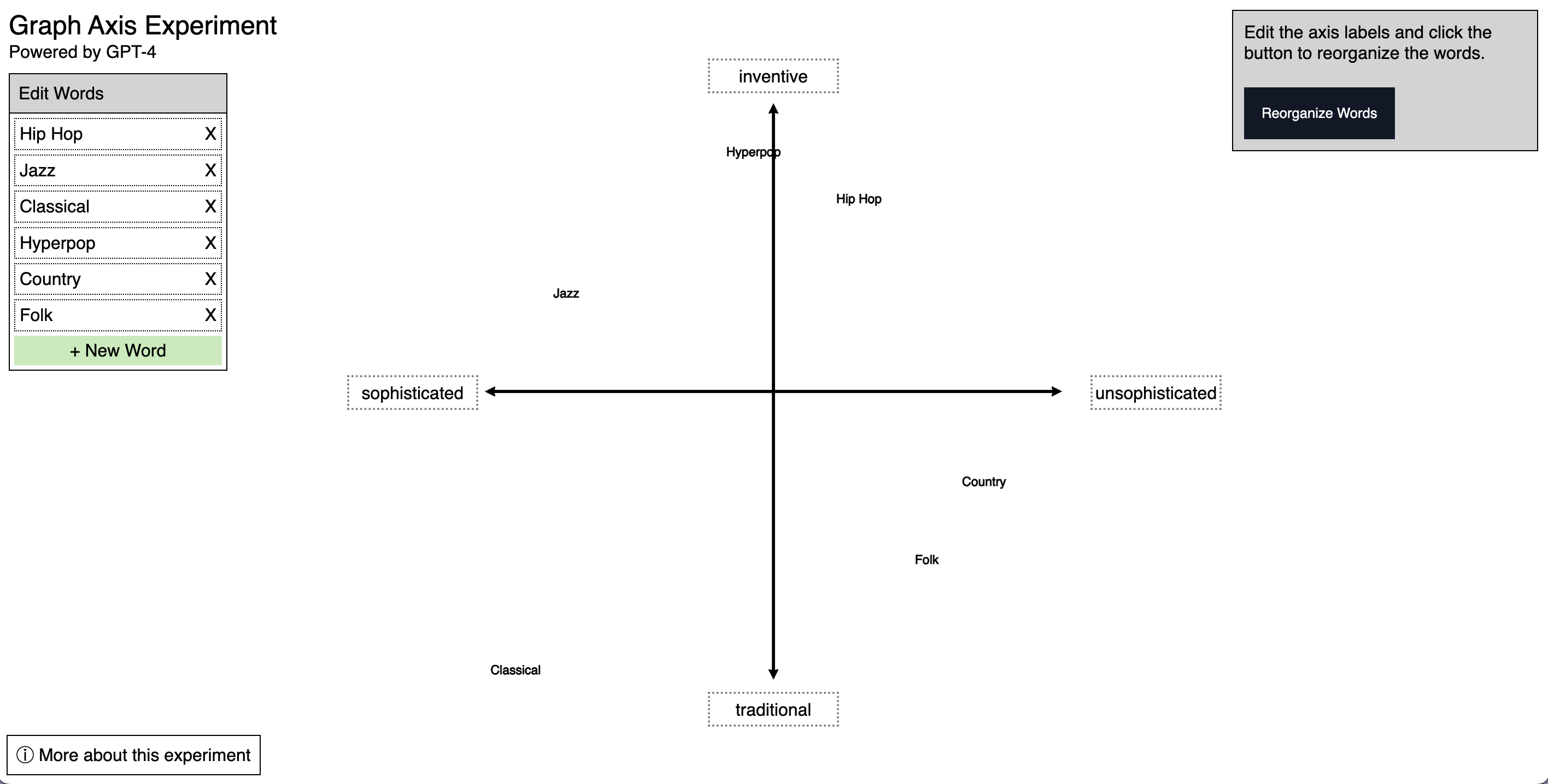 LLM Axis is a customizable word organization graph using GPT4. It's a way to explore the relationships between words and concepts. The graph axes and word list are fully customizable.