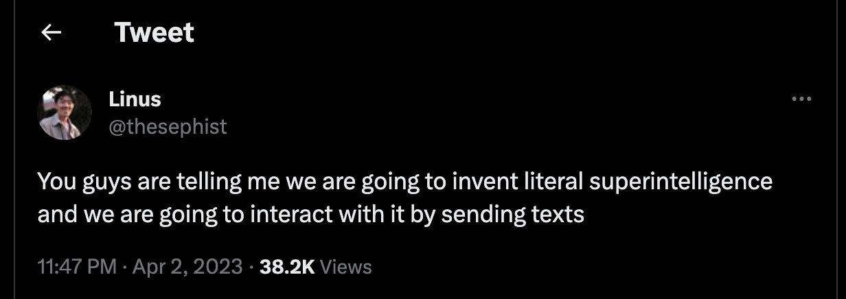 I think about this tweet a lot. I agree that the final form of working with large language models should not be "sending texts." This graph experiment was a way for me to explore some other forms of interacting with large language models.